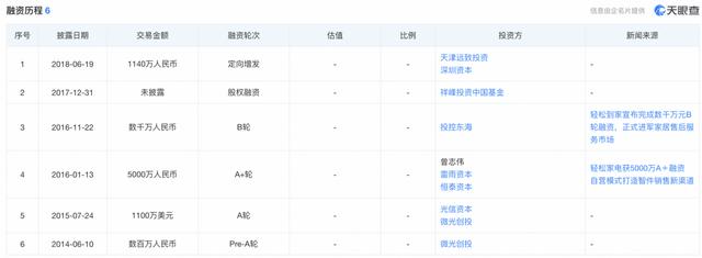 据天眼查APP显示,2014年至2018年间,轻松到家累计获得6轮融资,除上述官网提及投资方外,微光创投、恒泰资本、天津远致投资等亦参与投资。