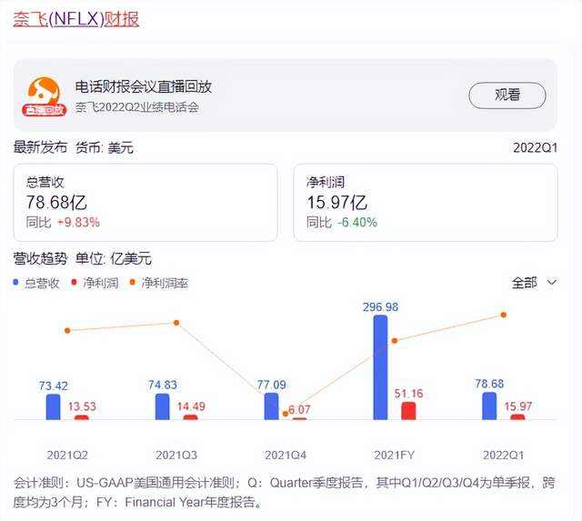 北京时间7月20日,奈飞公布了2022年第二季度财报,营收79.7亿美元,同比增长8.6%,低于华尔街预估的80.4亿美元;净利润14.41亿美元,同比增加8.65%。