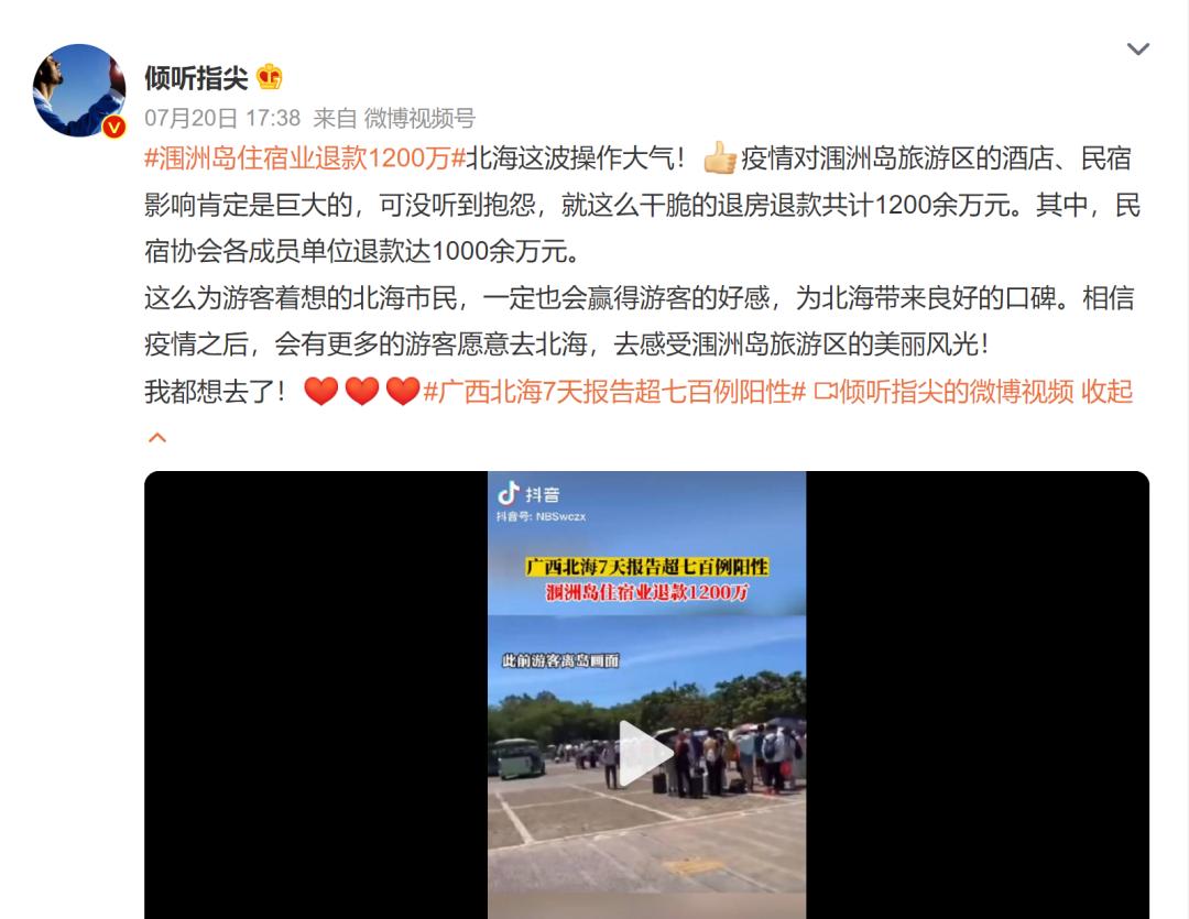 微博话题下#涠洲岛住宿业退款1200万#在琳姐所在的涠洲岛民宿群里引起巨大反弹,有博主称,“疫情对涠洲岛旅游区的酒店、民宿影响肯定是巨大的,可没听到抱怨,就这么干脆的退房退款共计1200余万元…”