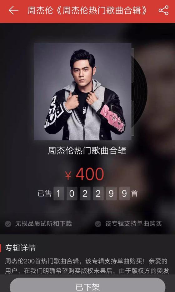在腾讯通知网易4月1日合作终止后,网易在3月31日晚上十点私信所有用户,将周杰伦所有歌曲打包成一个「合辑」,标价400出售。一直卖到1号早上7点。