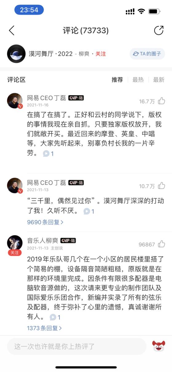 去年11月,《漠河舞厅》全网走红,丁磊也在网易云表达了对这首歌曲的偏爱,并表示「亲自抓版权」,原唱柳爽也入驻了网易云。