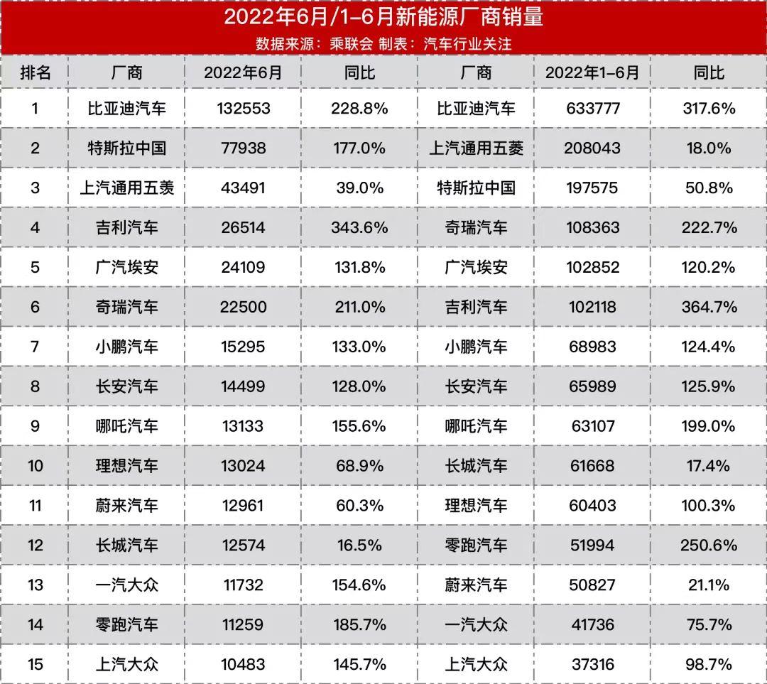 比如从乘联会公布的1~6月新能源汽车厂商销量来看,销量同比增长超过100%的车企就有9家,这说明,中国的新能源车企正在快速追赶。而特斯拉1~6月的增速仅18%,只是略高于理想,在头部车企中排行垫底。