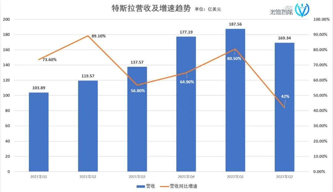 一方面,特斯拉二季度营收169.34亿美元,同比增长42%,但环比下跌了9.71%,略低于分析师此前预期的172.3亿美元。其中,特斯拉二季度来自汽车业务的营收为146.02亿美元,同比增长43%。