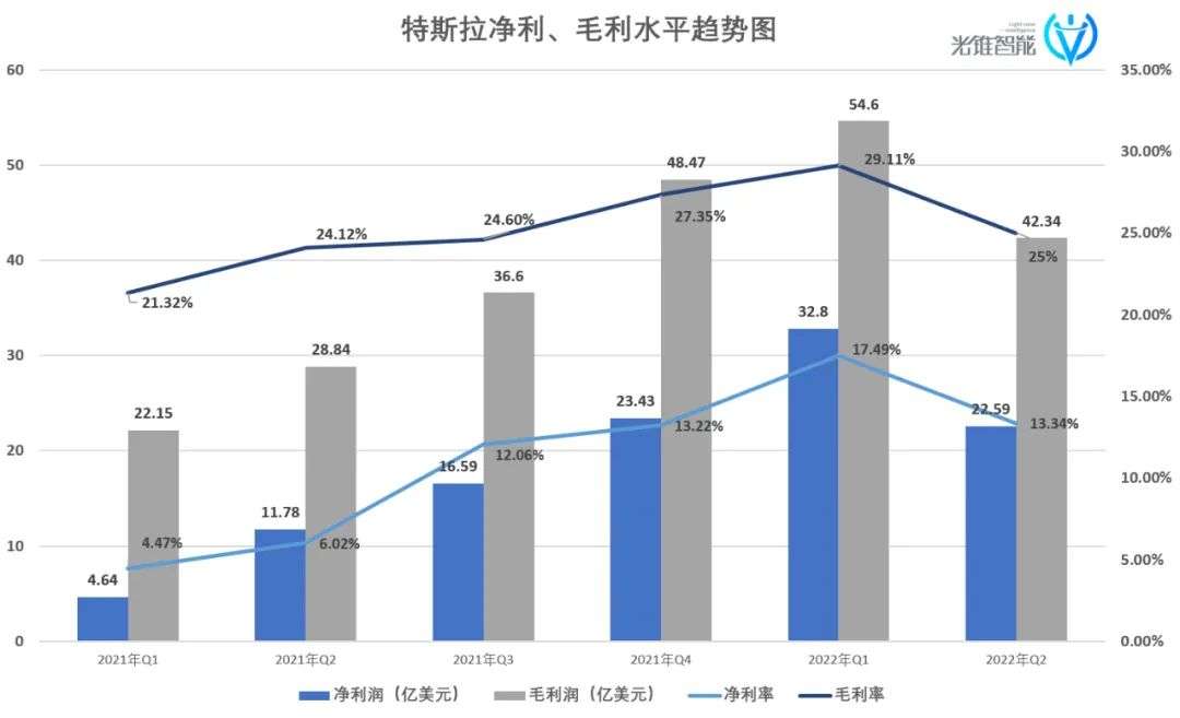 但另一方面,二季度特斯拉毛利率从一季度的29.1%降至25%。同时,二季度汽车业务在GAAP口径下毛利率为27.9%,不仅低于一季度的32.9%和去年二季度的28.4%,同时也是最近4个季度汽车业务毛利率首次低于30%。不过这一数据依然高于国内大多数的造车新势力。