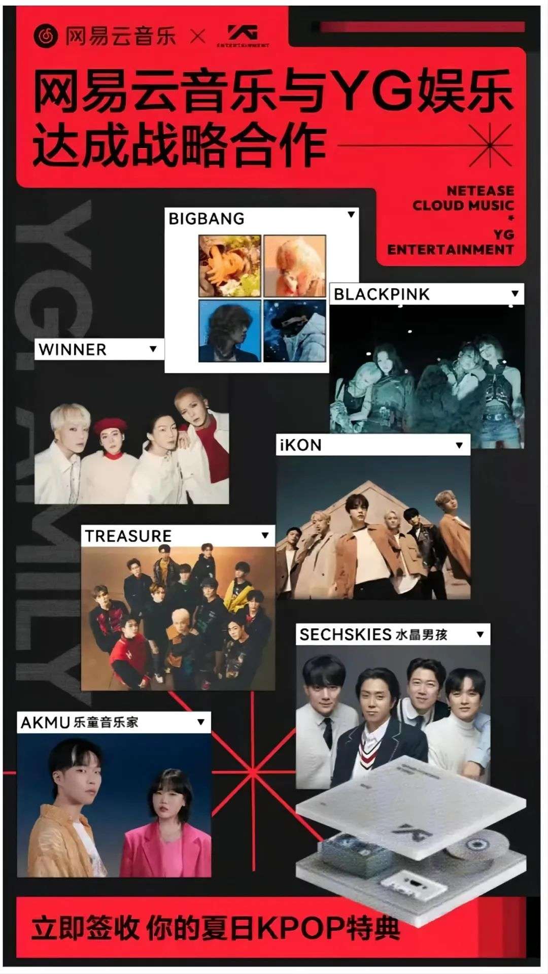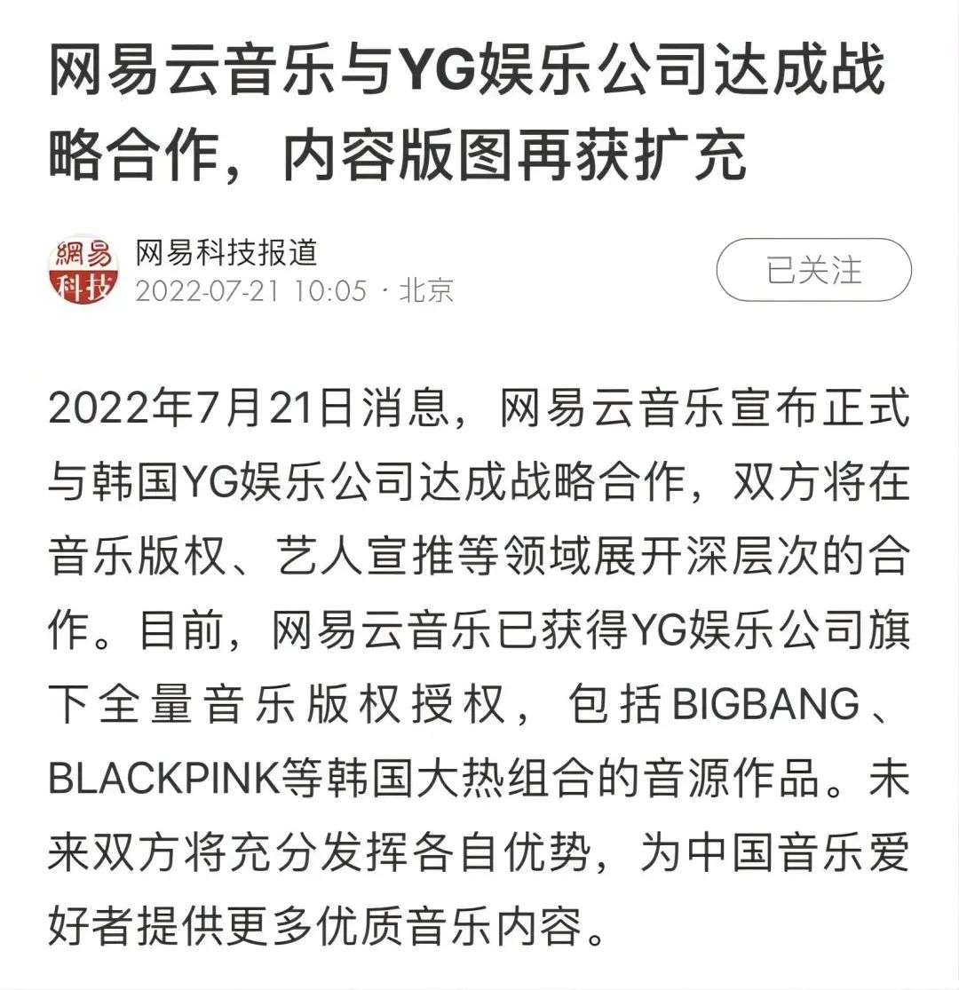 就在7月21号,网易云音乐宣布和韩国三大娱乐公司之一YG娱乐达成版权合作。