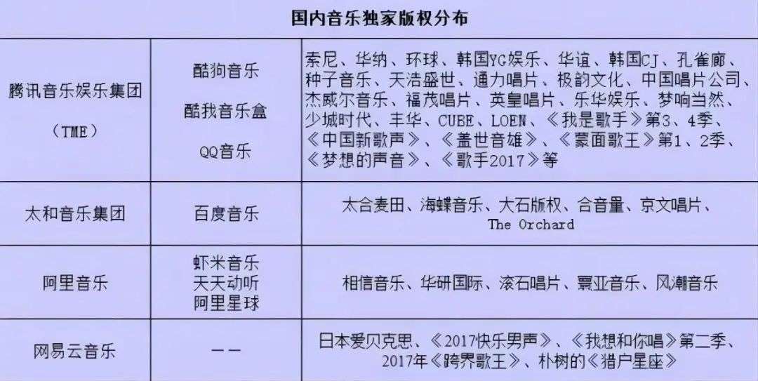 2017年音乐市场的版权分布可以说极不均匀。 而目前,平心而论,除了确实还有少数几家华语流行版权的缺失,应该说,包括全球三大唱片集团环球、索尼、华纳在内,大部分的版权短板网易云是已经补上了。