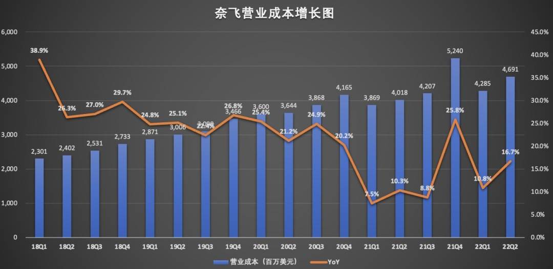 2021年,奈飞在内容上花费170亿美元。管理层对今年的内容投资规模预期仍然维持在170亿美元。今年二季度,奈飞的运营成本同比增长16.7%至46.91亿美元,这一增速高于上年同期的10.3%和上一季度的10.8%。运营成本营收占比,从上年同期的54.7%上升至本季度的58.9%。