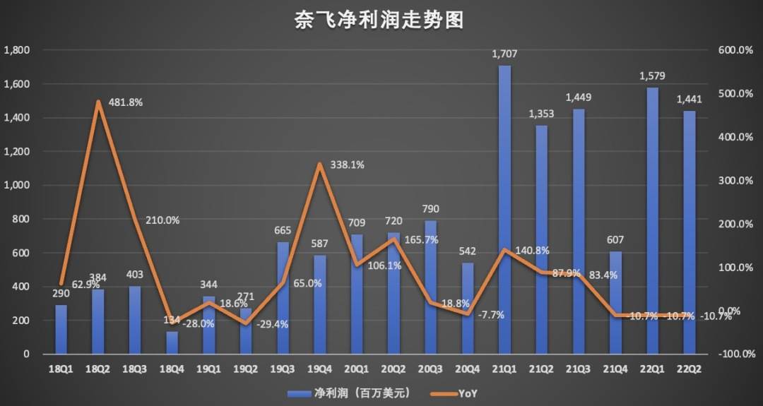 净利润方面,奈飞今年二季度净利润为14.41,同比仅增长6.5%,而上年同期的净利润同比增速则高达87.9%。