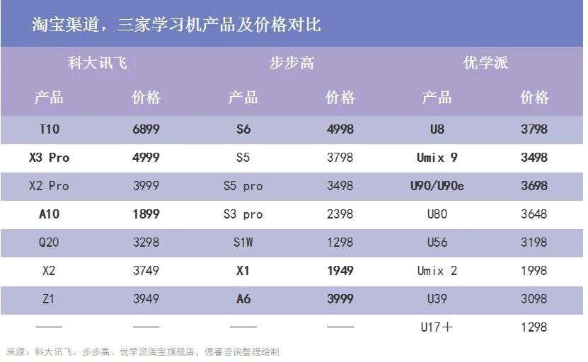 销量top 3产品均价分别为,4599元、3649元及3998元,均价上,科大讯比步步高、优学派分别高出910元和601元,对于学习机来说,价格差距不算小。