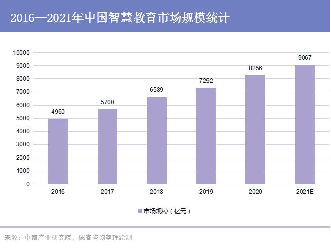 中商产业研究院数据,我国智慧教育发展迅速,从2016年的4960亿元到2020年的8256亿元,涨幅高达66.5%,可见是一块很大的市场蛋糕。