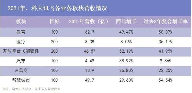 我们不妨简单复盘一下讯飞的基本盘。董事长刘庆峰曾多次强调,要坚守“GBC联动下的根据地业务+系统性创新”的战略路线。然而,2021年,教育根据地业务营收62.3亿,距离2025年的300亿目标还差4倍,承担系统性创新的医疗和C端两大板块,2021年营收分别为3.38亿和46.87亿,距离200亿目标还有不少距离,其中,医疗板块无论是规模还是增速,似乎都没达到预期。