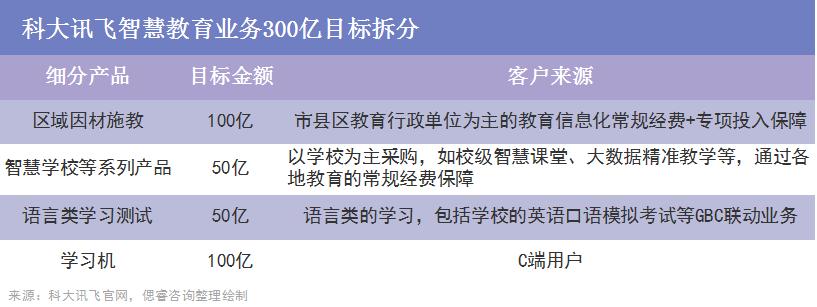 智慧教育发展顺风顺水,科大讯飞的千亿目标,分配给智慧教育的目标有300亿: