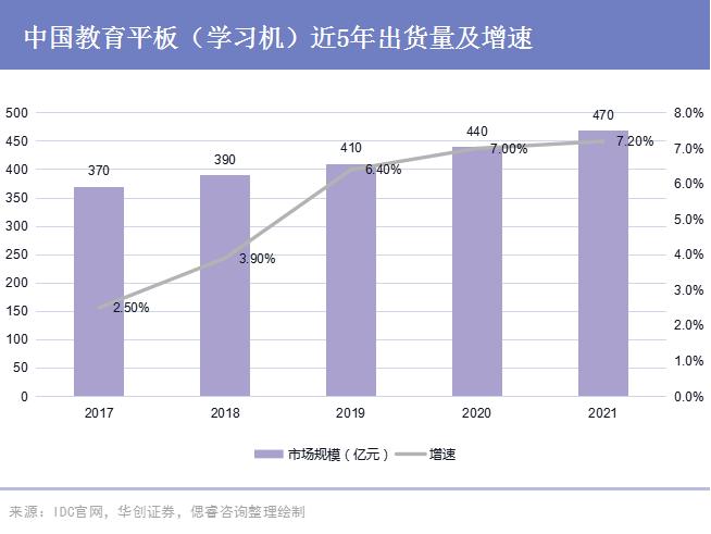 IDC数据显示,2021年,中国学习机出货量仅470万台,近五年出货量增速不及10%。同时,结合教育部数据,2020年K12阶段学生约1.98亿,同年学习机出货440万,渗透率仅2.2%。