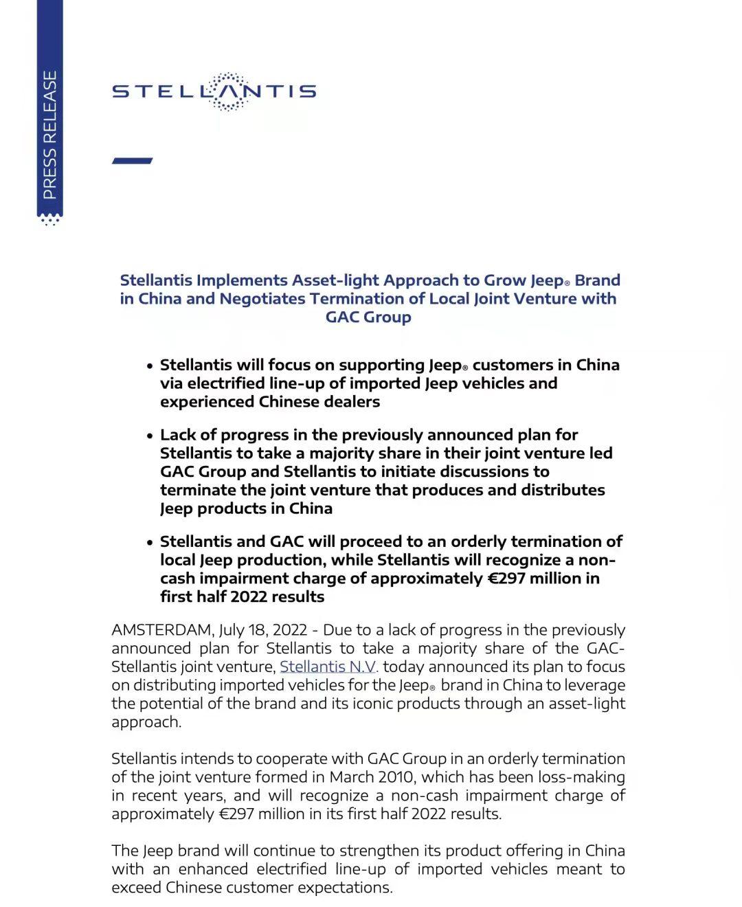 7月18日,Stellantis发文表示,已经终止与广汽集团的合资公司,并采取轻量化的方式在中国运营Jeep品牌。根据公告信息,Stellantis将专注于在中国分销Jeep品牌的进口汽车,并继续完善该品牌的电气化阵容。