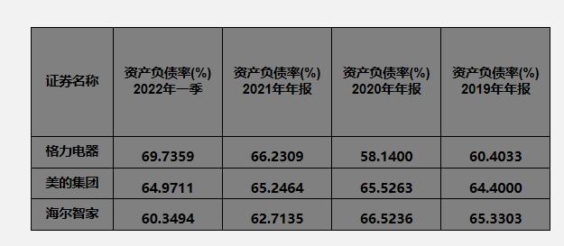 负债率又如何?2019年格力的负债率是60%,到2022年一季度飙升到了69.7%,变成了3家可比对手的里边负债率最高的。