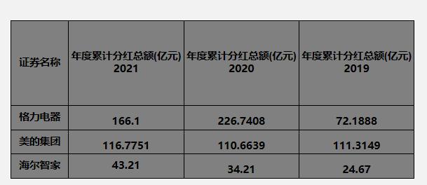 我们再看一看格力的分红,格力的分红在A股上市公司来说是非常好的,在三家可对比的同行里边,分红最好的还是格力。