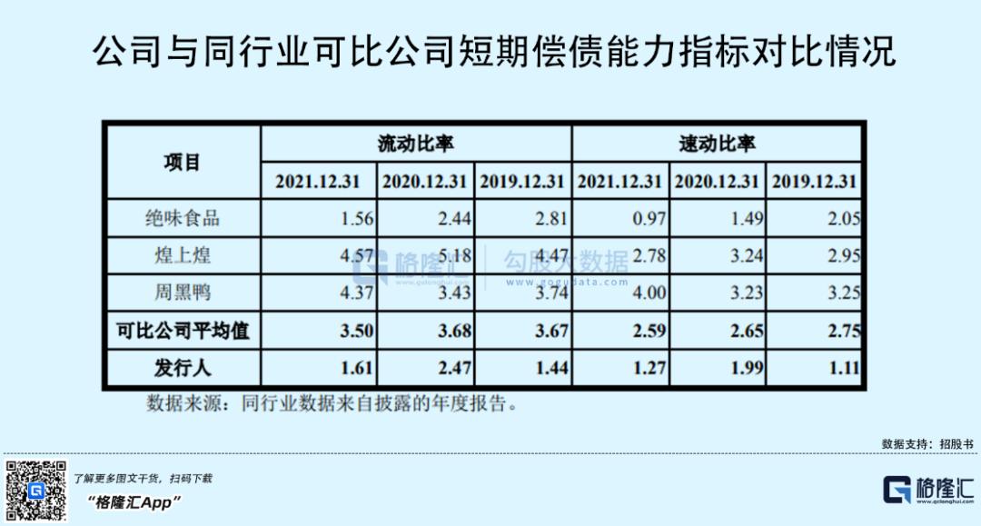 而基于德州扒鸡产业链延伸较长,相关业务的资金需求较高,报告期内,公司流动比率、速动比率低于行业平均值,德州扒鸡的资产负债率从2019年的38.74%升至2021年的56.44%,远高于同行的均值,整体偿债能力较弱。