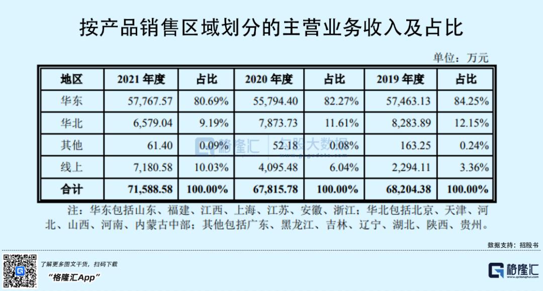 报告期内,按地域划分,德州扒鸡来自华东地区的收入占比均超八成,对其他地区覆盖较少。