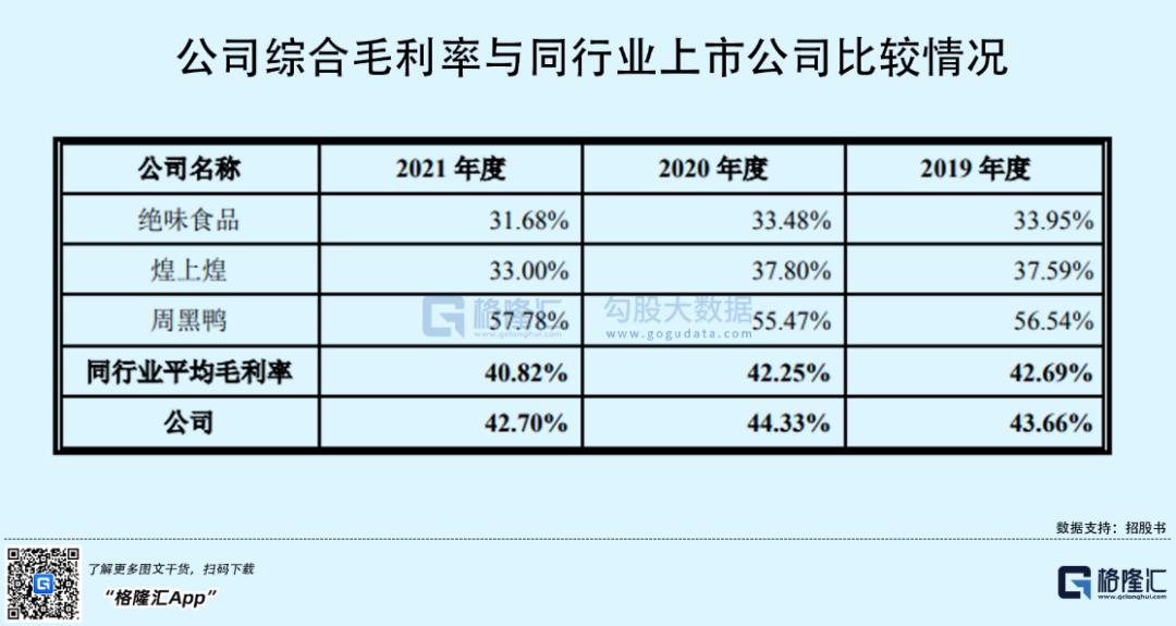 报告期内,德州扒鸡综合毛利率分别为43.66%、44.33%、42.7%,存在波动,低于周黑鸭,高于绝味食品和煌上煌。