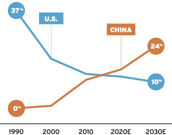 (图注:过去30年美国芯片产能全球比重已经从37%下滑到了10%)