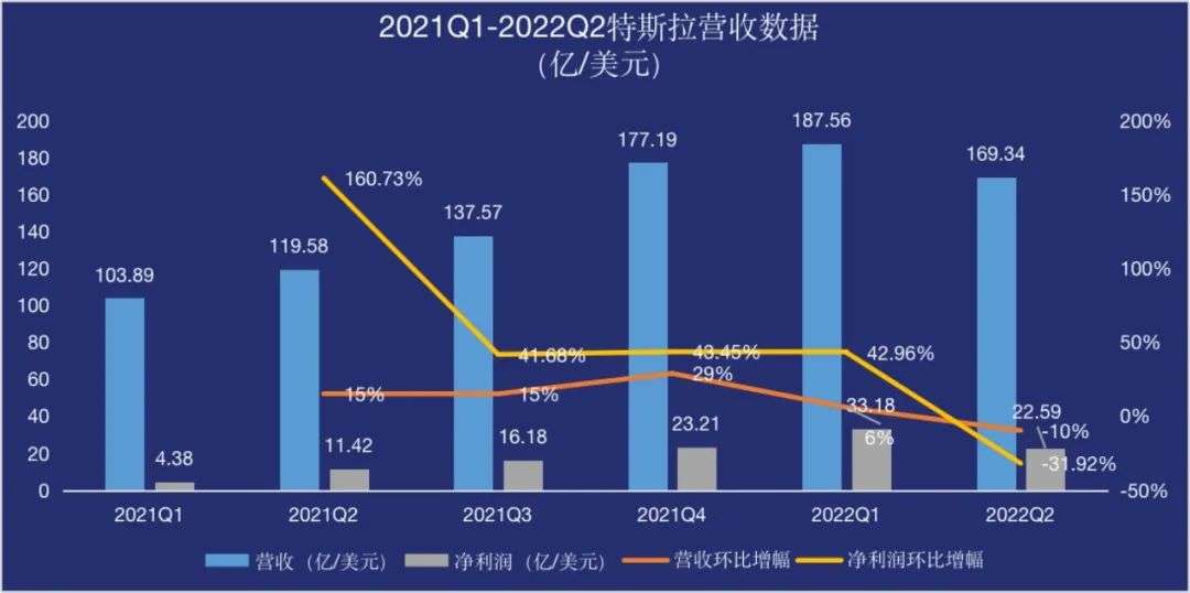 首先,特斯拉的营收与净利润同比增幅大幅下滑,且环比双双下降。