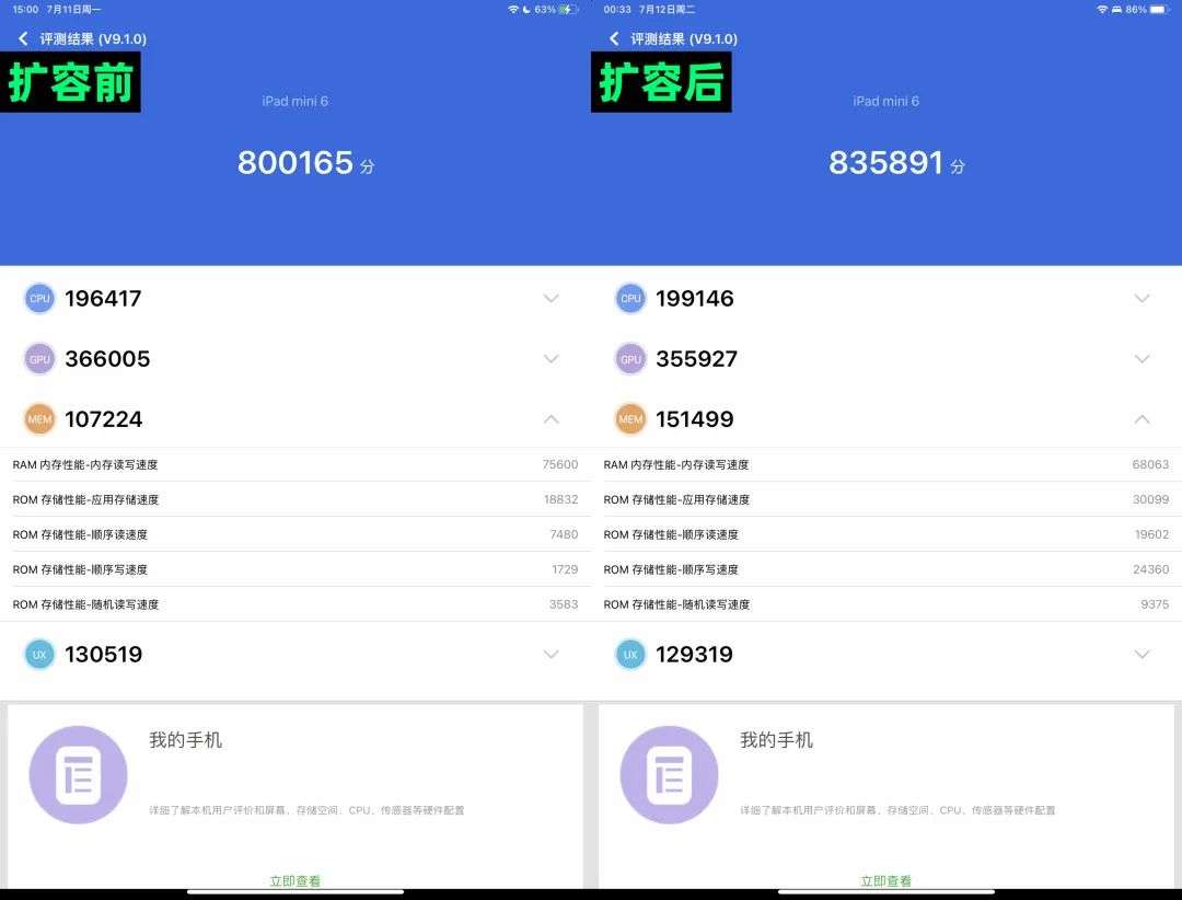 以至于扩容后这台 iPad 的安兔兔跑分直接涨了 3W,这是我没想到的。。。