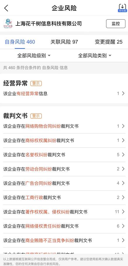 世纪佳缘官网显示,公司名称为上海花千树信息科技有限公司,注册地址在上海。据第三方商查平台数据,如今该企业自身风险高达460条,关联风险已累计97条,变更提示也有25条。且自2022年7月以来,百合佳缘公司已新增两则被执行人信息,执行标的分别为2.1万余元、1.7万余元。北京花千树、上海花千树也曾有多条被法院强制执行的历史记录。