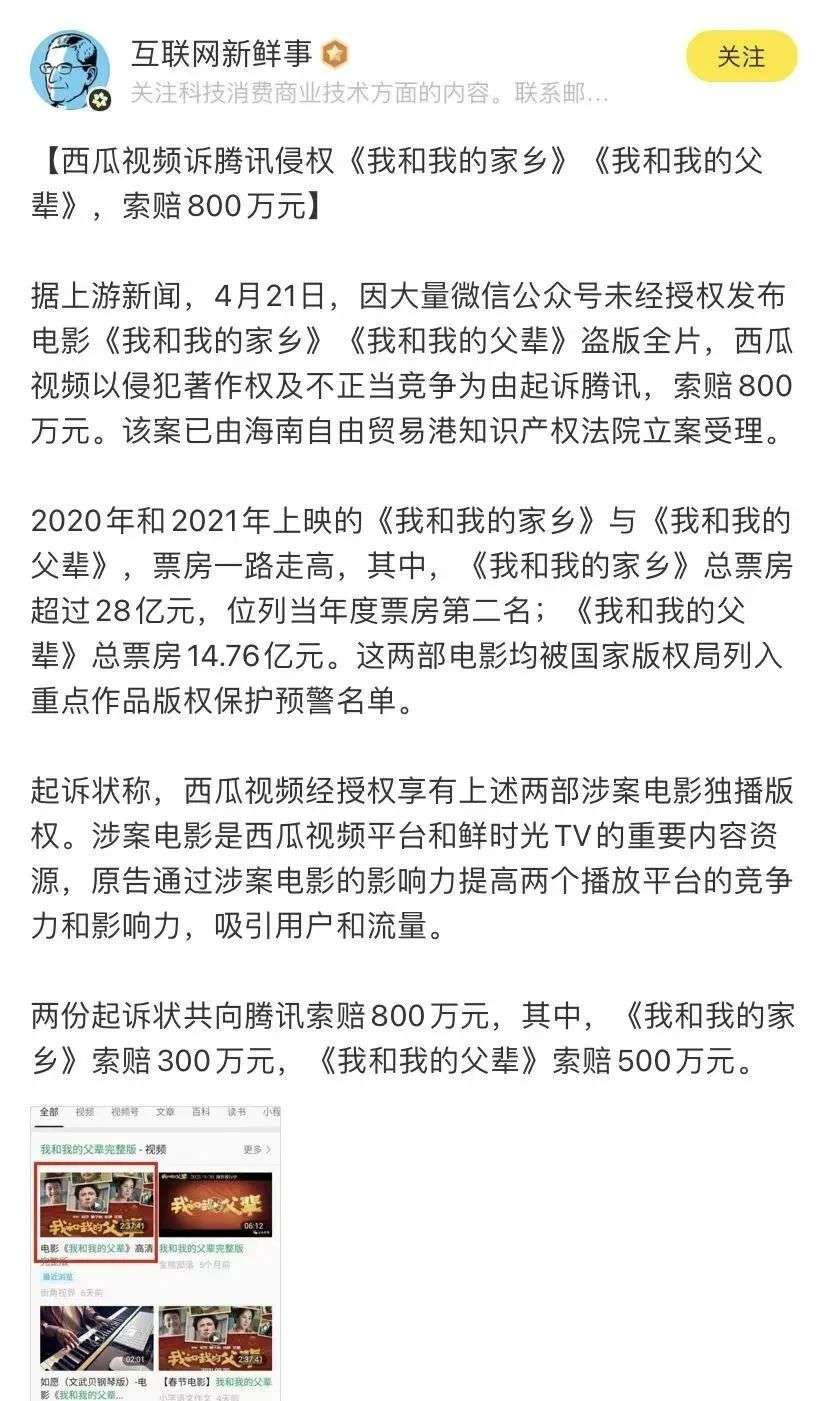 另外,一个案例也让我们看到西瓜存在的价值。今年4月,西瓜视频诉腾讯侵权《我和我的家乡》、《我和我的父辈》索赔800万元案。起诉状称,大量微信公众号未经授权发布了这两部电影的全片,而西瓜视频享有这两部电影的独播权。
