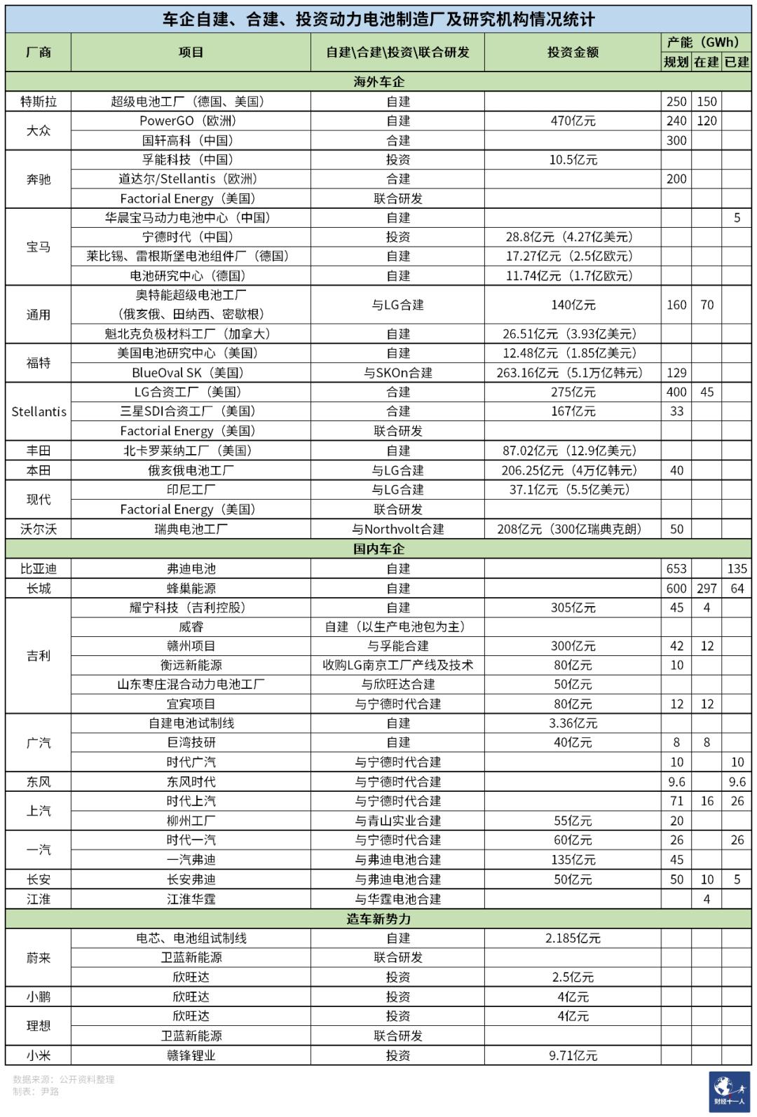 《财经十一人》根据公开资料整理,车企对外公开宣布的自建及合资建设的动力电池的产能规划已经超过3000GWh。这其中肯定有不少项目最终无法达到规划产能,但即便只统计在建和已建产能,也超过1000GWh。