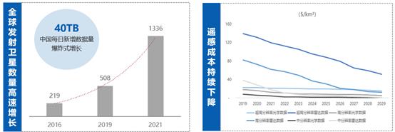 根据36氪与珈和科技联合发布的《2021遥感产业研究报告》,遥感卫星进入工业化时代后,遥感卫星应用服务复合年增长率为20.4%,有研究数据显示,2022年,全球高分辨率光学数据价格预计将跌至10.7美元/景,较上一年下降约15%;2022年,全球中分辨率光学数据价格将跌至2美元/景,较上一年下降约13%。遥感卫星应用产业也正在从导入期向成长期过渡,此前卫星遥感应用的市场主要集中在军工和省部级政府特殊应用领域,虽然也有通过卫星地图、天气预报等走进大众生活,但需要应用的企业和大众市场并没有完全被打开。
