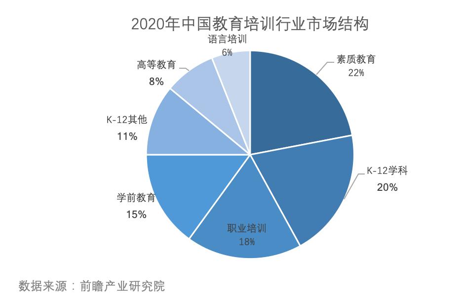 不过,虽然K-12学科培训过去的重要性不言而喻,但它并不是“双减”前中国教培市场规模最大的板块。前瞻产业研究院数据显示,2020年,中国教育培训行业市场规模整体达到人民币20560亿元,占比最大的为素质教育(22%),其次才是K-12学科培训(20%);另外,职业培训、学前教育的占比并不低。