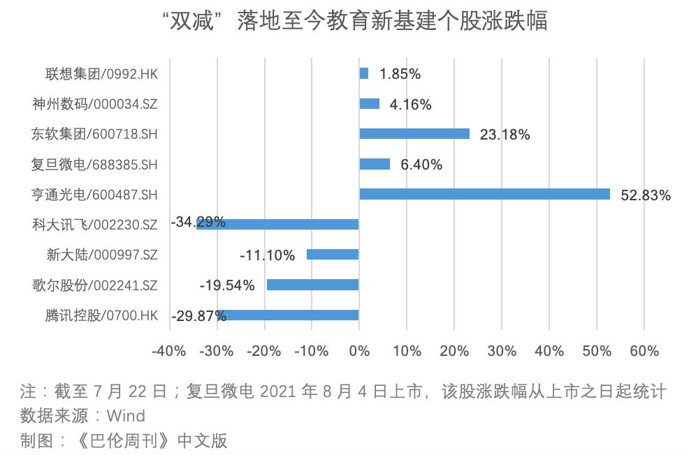 与“双减”几乎同时落地的一项政策是《关于推进教育新型基础设施建设构建高质量教育支撑体系的指导意见》,明确指出到2025年,基本形成结构优化、集约高效、安全可靠的教育新型基础设施体系。《巴伦周刊》中文版曾在去年的报道中写道,“教育新基建”将成为教育赛道的投资关键词。