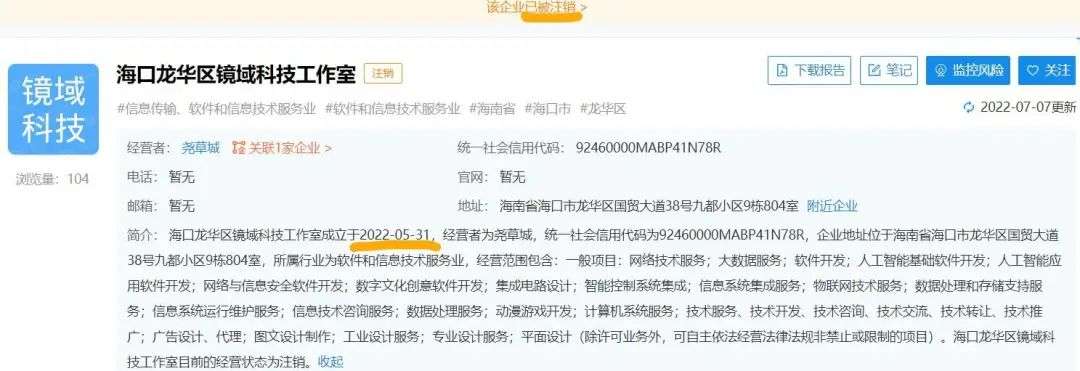 「镜域数藏」平台,188 元的数字藏品 1 天卖出了 1971 份,今年 5 月 31 日创立公司,6 月 22 日注销营业执照,创下数藏平台的最快跑路纪录。