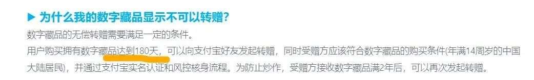 阿里巴巴的鲸探,也明确表示不支持任何形式的转卖行为,仅支持买家 180 天后无偿转赠给符合条件的支付宝实名好友。还有一些平台,转赠期限从 1 天到 30 天不等。