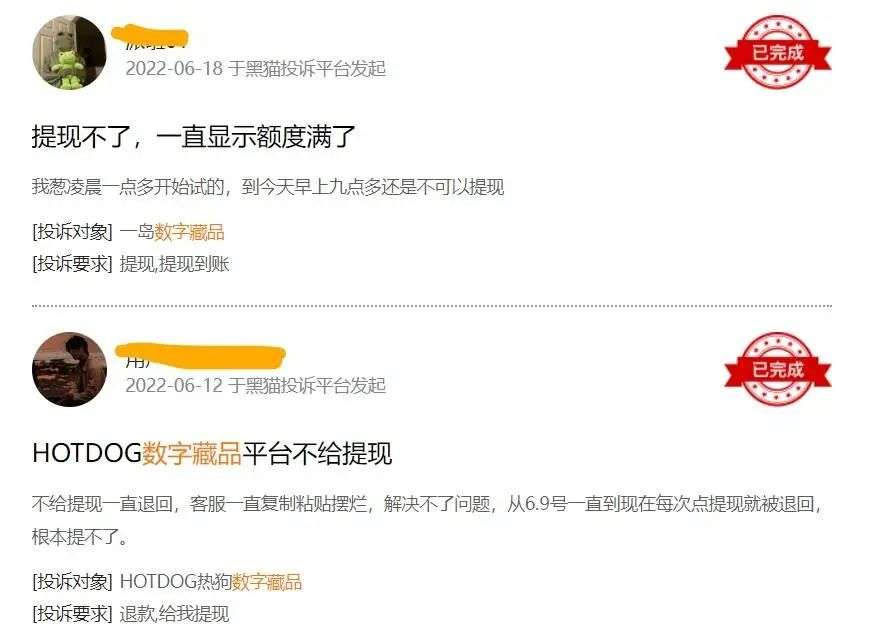 出现提现问题的不止光艺数藏,黑猫投诉上搜索「数字藏品 提现」可发现 130 多条。