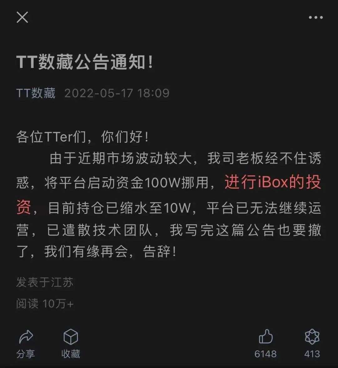 「TT数藏」平台跑路,原因是老板投资了其他的数字藏品平台,亏损严重后自家平台无以为继。