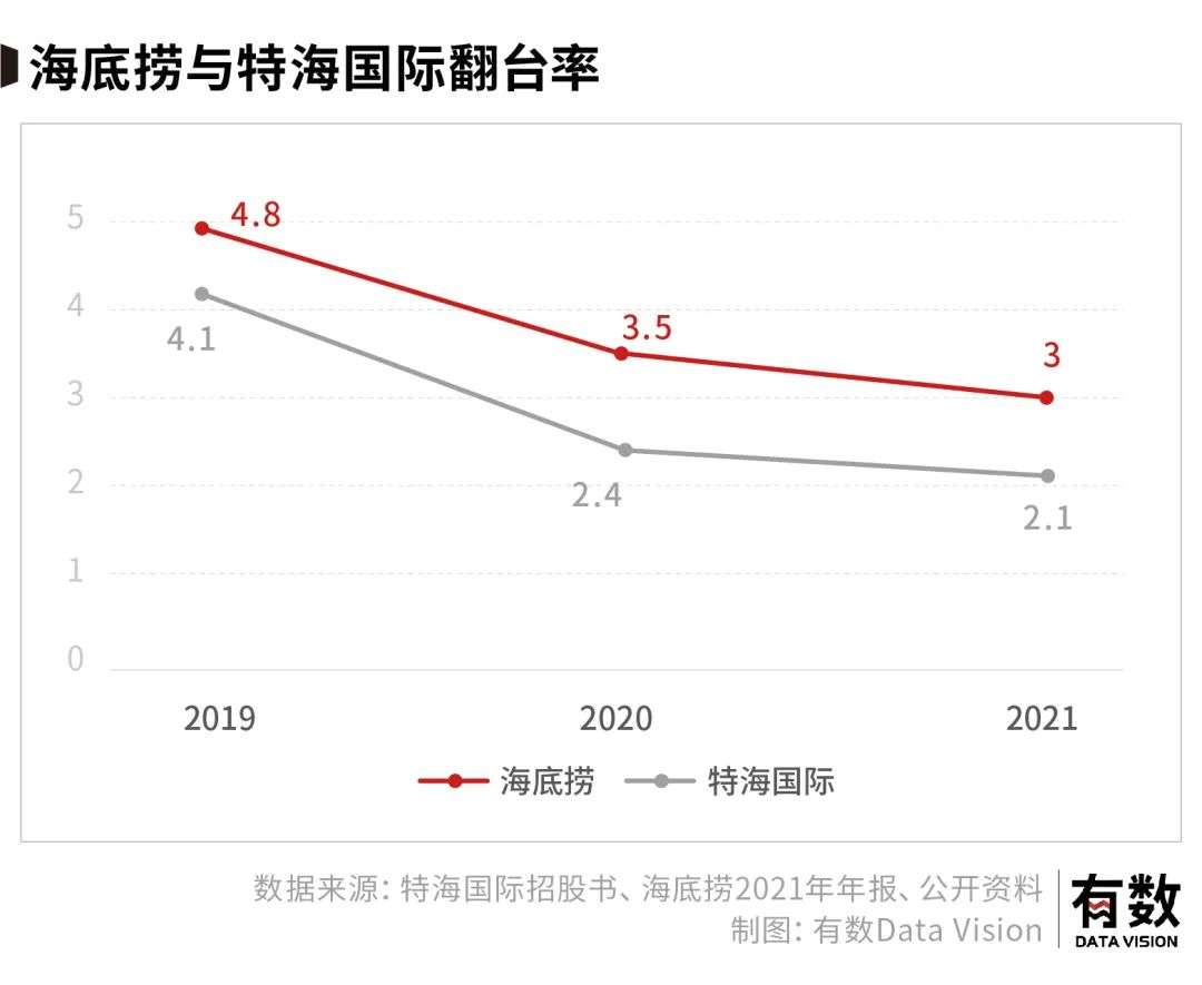 首先是翻台率:根据特海国际招股书显示,特海国际翻台率已经从2019年的4.1次/天降至2021年的2.1次/天,几乎腰斩,海底捞也是从2019年的4.8降低至3的水平。