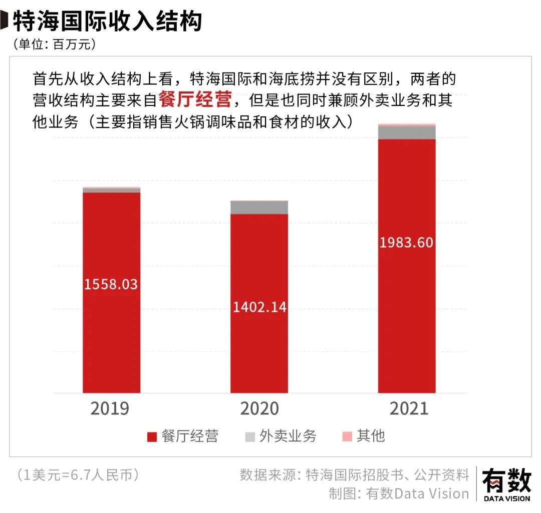 从收入结构上看,两者的营收主要来自餐厅经营,也同时兼顾外卖业务和其他业务(主要指销售火锅调味品和食材的收入)。