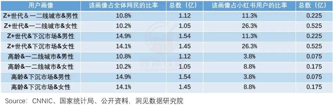 如此一来,小红书想要“抢人”,可以瞄准的群体有4个,即其他年轻女性、男性、下沉和高龄用户。