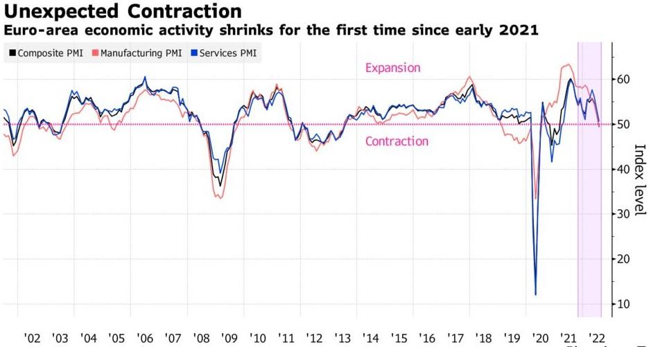 如果单看欧洲,经济形势也不容乐观。Markit 7月22日公布的数据显示,自2021年初疫情封锁以来,欧元区经济活动首次意外收缩,进一步表明衰退可能即将到来。当日稍早公布的另一项数据显示,欧洲经济“火车头”德国经济活动也意外萎缩,而法国的报告也显示出经济衰退的迹象。