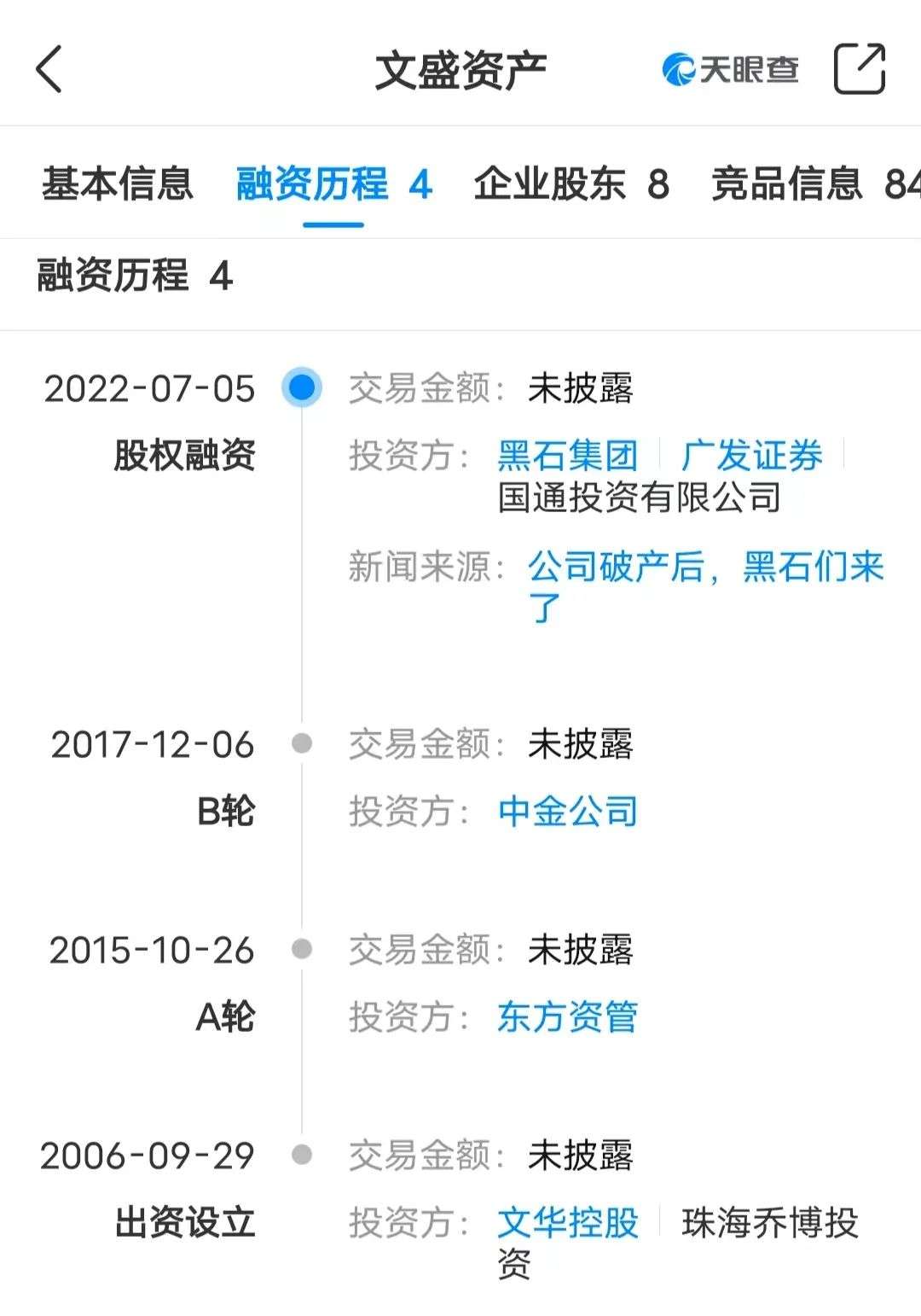 根据文盛官网消息,黑石与国通投资有限公司、广发证券有限公司于2021年10月在文盛资产的第三轮融资中进行了股权投资,并于2022年6月完成投资。