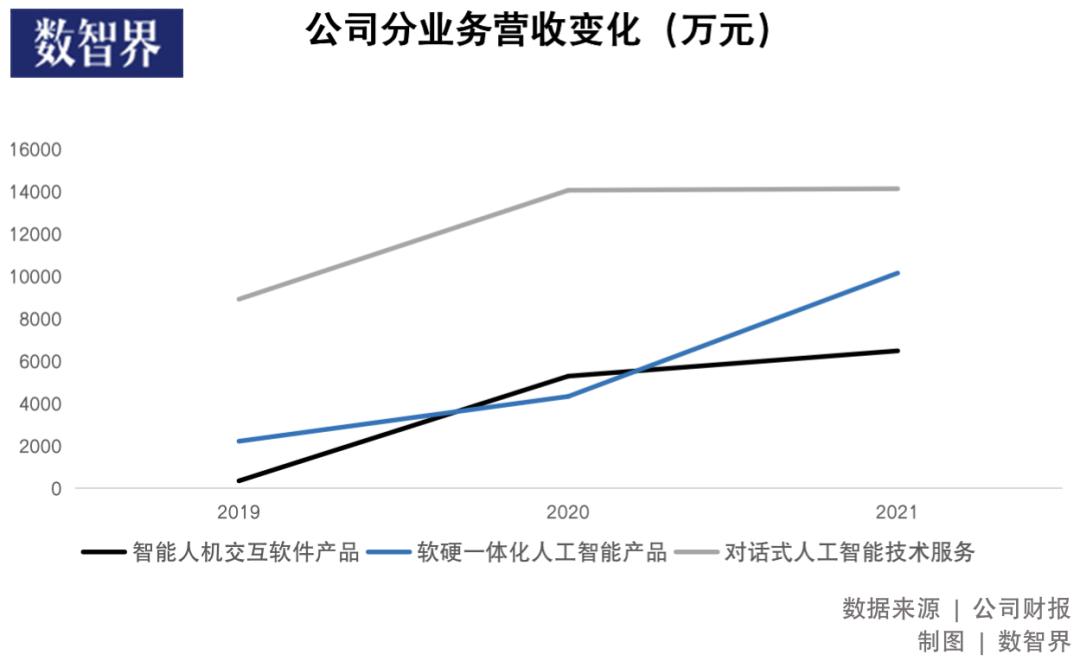其中,智能人机交互软件产品营收为6474万元,占总营收比例为21.06%;软硬一体化人工智能产品营收为1.01亿元,占营收比例为33%;对话式人工智能技术服务营收为约1.41亿元,占营收比例约46%。
