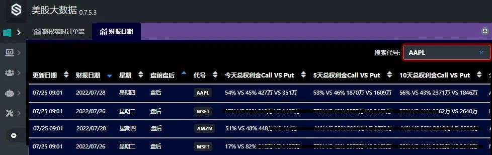 我们美股大数据 量化交易终端 StockWe 已经利用机构们过去两周提前布局多空百万大单,去统计出财报前,机构的看涨和看跌期权比例