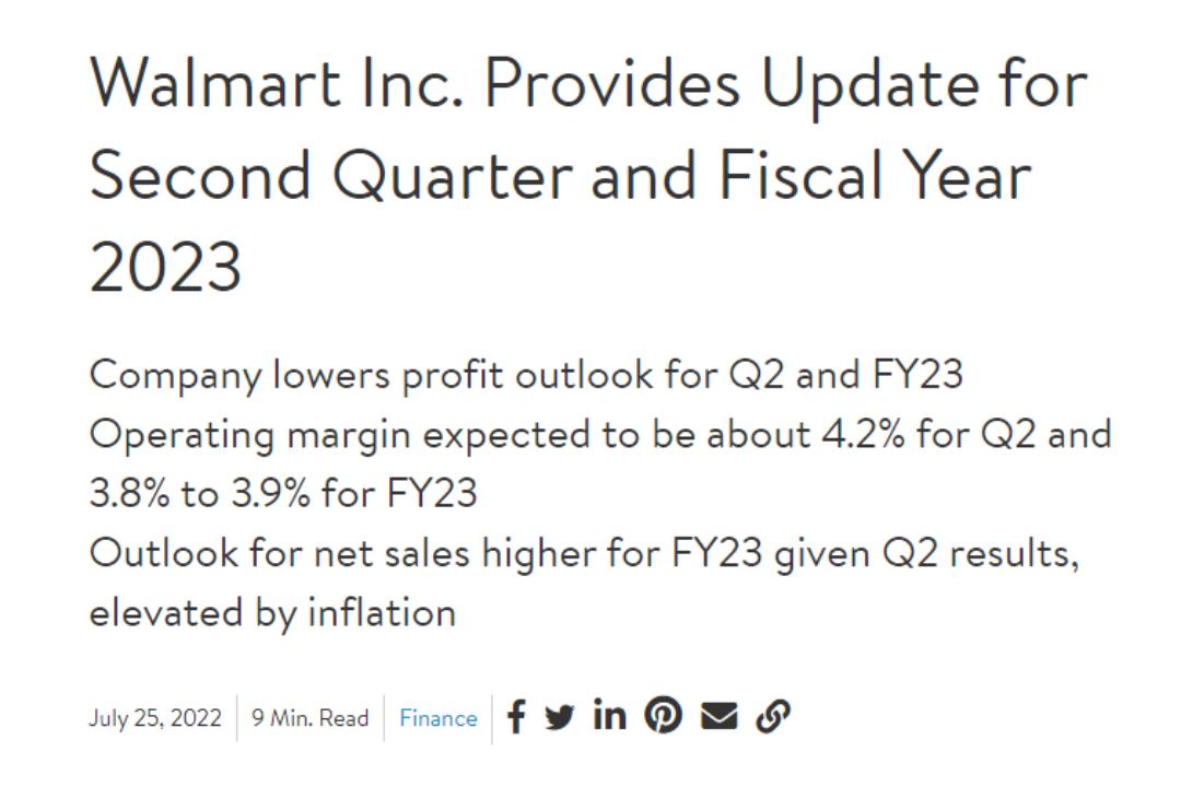 食品和燃料通胀水平的不断提高正在影响顾客的消费方式,美国沃尔玛需要通过降价来调整库存,沃尔玛周一盘后突发公布,下调了第二财季和2023财年运营利润预期。