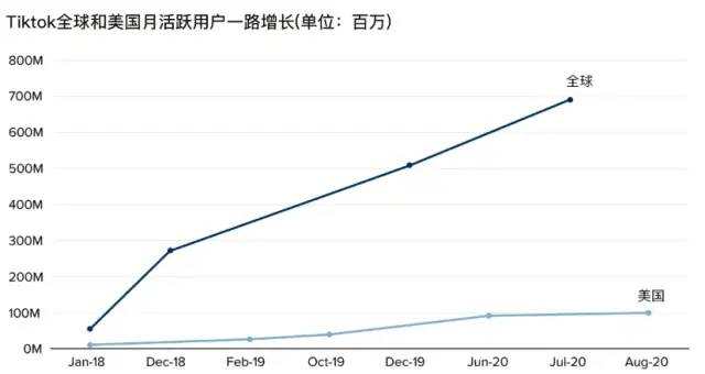 2020年8月,TikTok首次详细公布了全球和美国月活跃用户数据,展示了公司的高速增长态势。TikTok当时透露,2018年1月时,约有1100万美国人使用其应用。但是自那之后,其美国月活跃用户累计增长了近800%,达到大约1亿人。