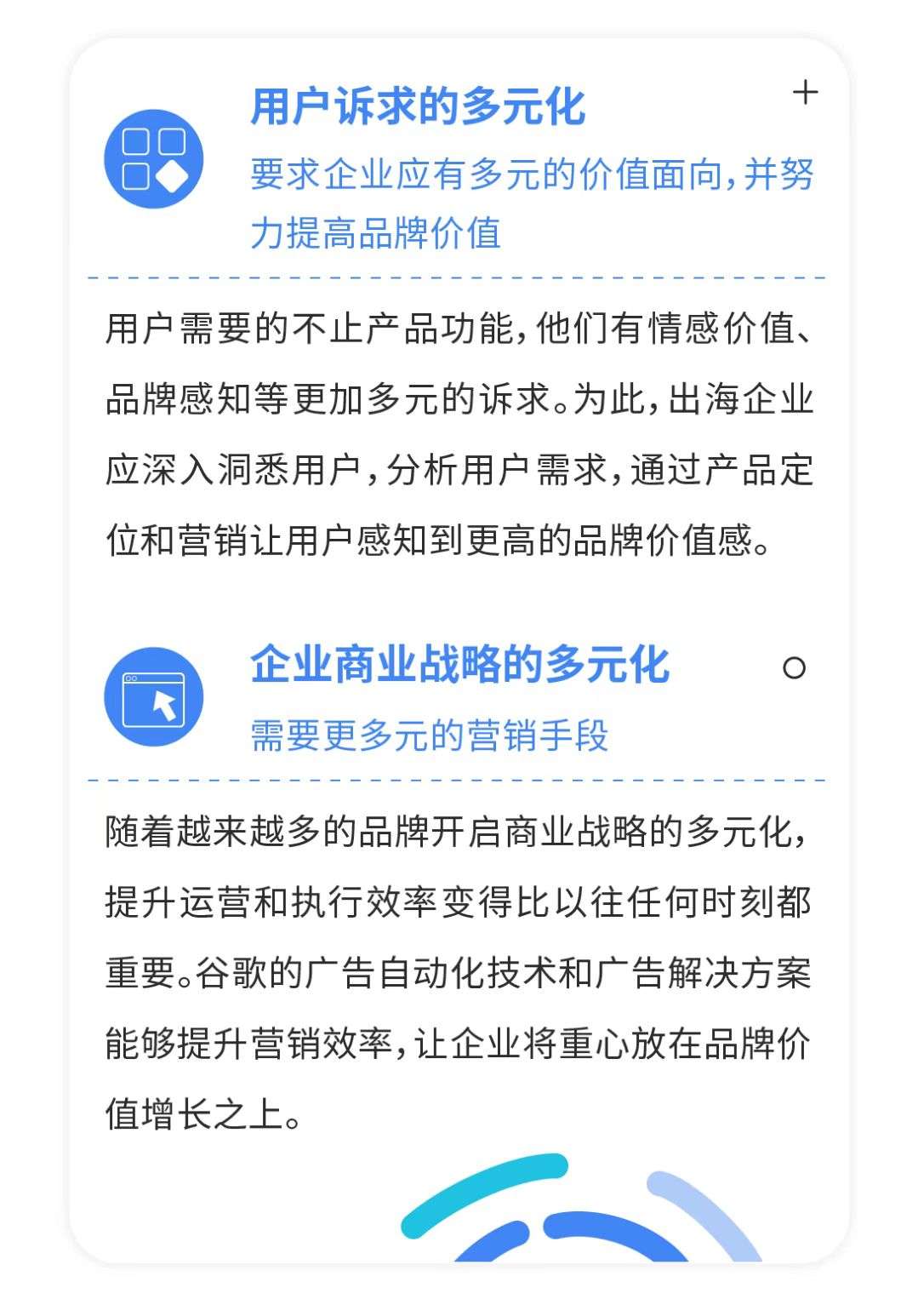 在多元出海时代,利用更先进的广告产品,提升数字营销和决策效率,是中国出海企业强化竞争力的必备技能。广告隐私愈加重要的当下,谷歌很荣幸在多元出海的方向上,持续提供先进的自动化技术和创新的数据、营销解决方案,助力客户加速走向全球。