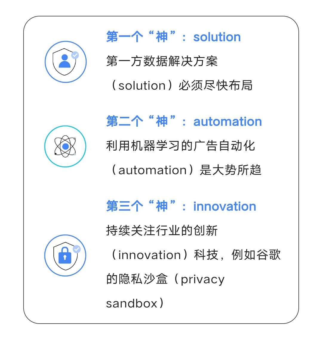 广告隐私的变化是深刻的变革,对营销人员来说既是挑战也是机遇。今天的广告主应当如何应对?谷歌大中华区移动应用与衡量产品专家团队负责人姬静涛在Think with Google上提出了对于营销人员的“三神”指导理念: