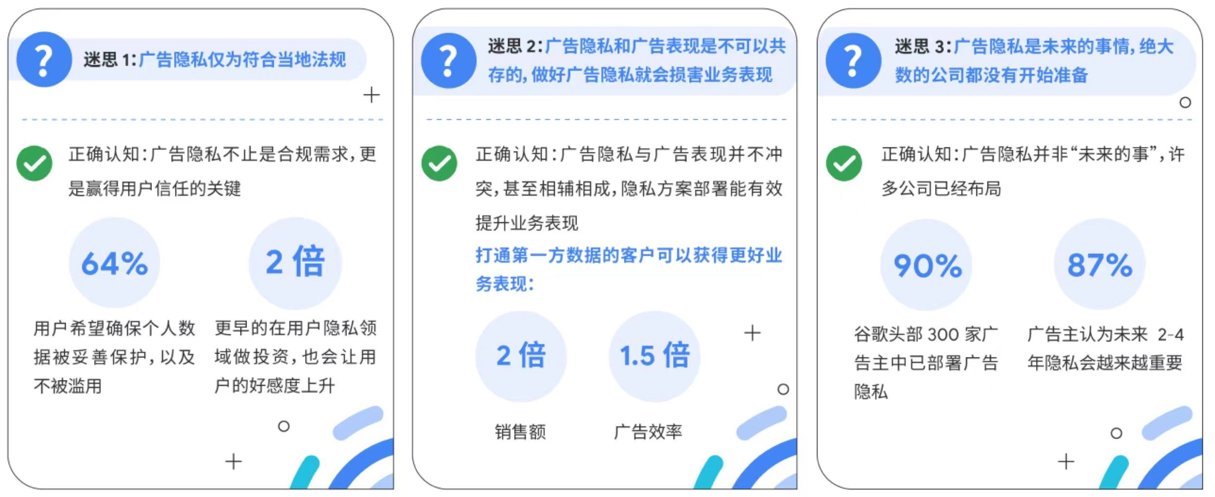 在每个重要阶段,谷歌都能提供相应广告隐私解决方案,以兼顾数据隐私和营销效果。
