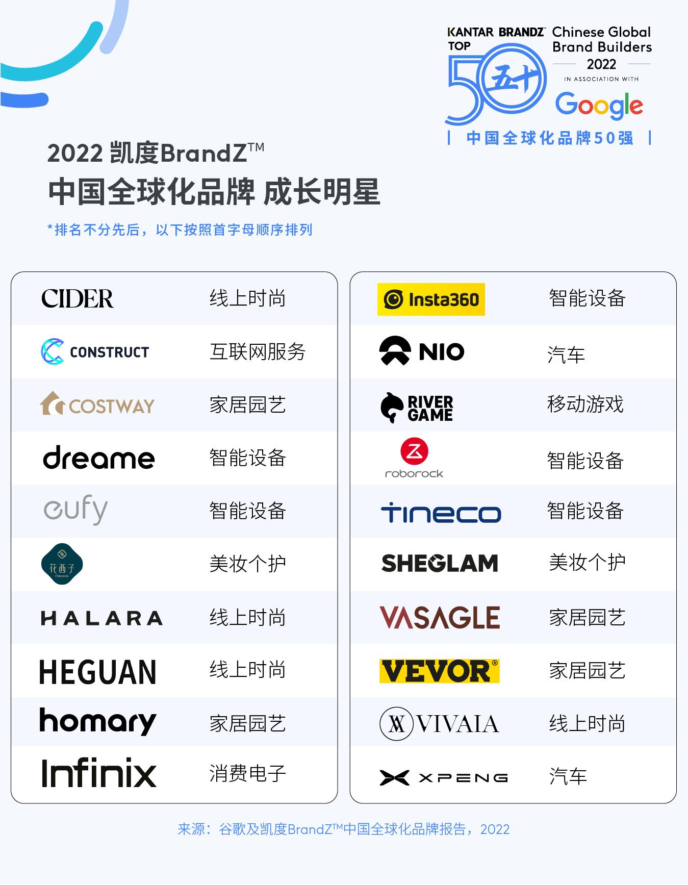 新兴品牌的实力也不容小觑,今年的《凯度BrandZ™中国全球化品牌》报告中,我们首次评选出全球化成长明星子榜单,展示新一代中国全球化品牌的面貌。