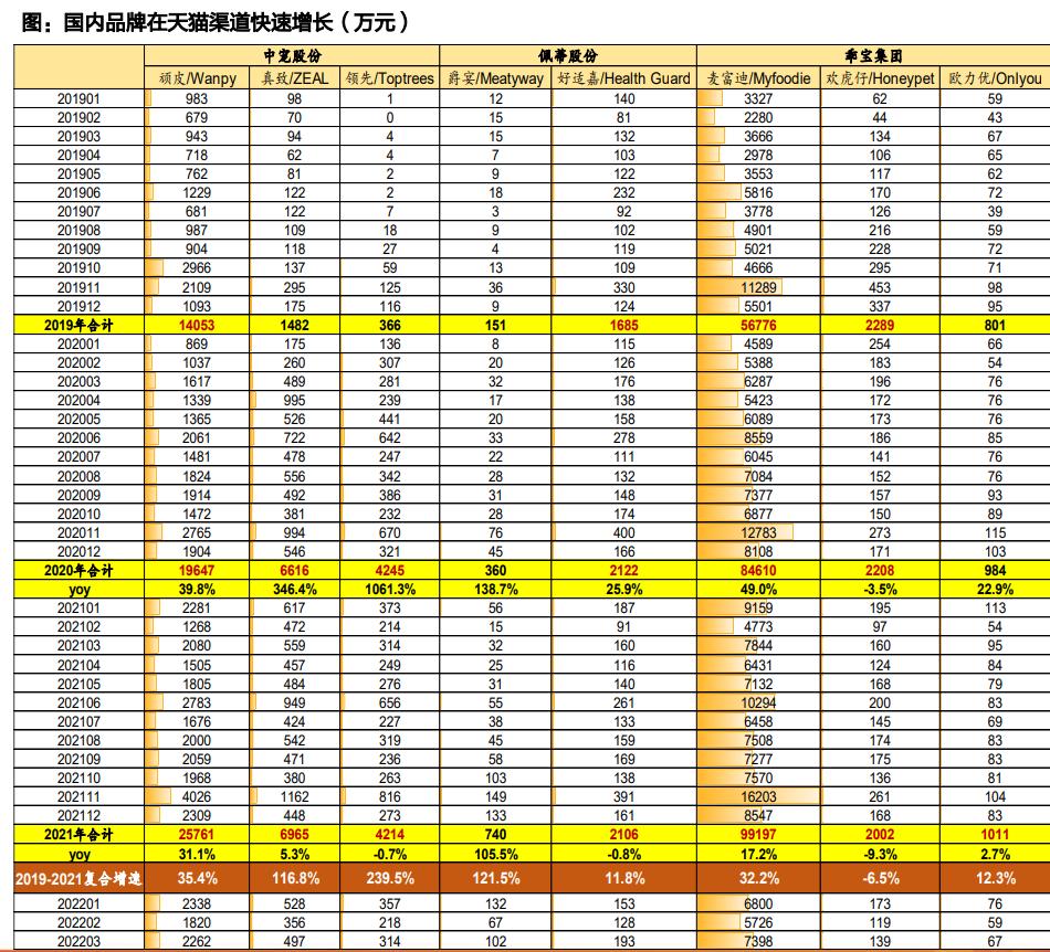与中宠股份、佩蒂股份相比,乖宝宠物的线上销售成绩几乎是一骑绝尘。天风证券统计了三大国内宠物品牌在天猫的销售成绩。乖宝宠物旗下“麦富迪”2021年通过天猫渠道实现了9.91亿元人民币的销售额,三年复合增速32.2%。再加上“欢虎仔”、“欧力优”等的销售数据,乖宝宠物2021年在天猫渠道实现了超10亿元的线上销售额。